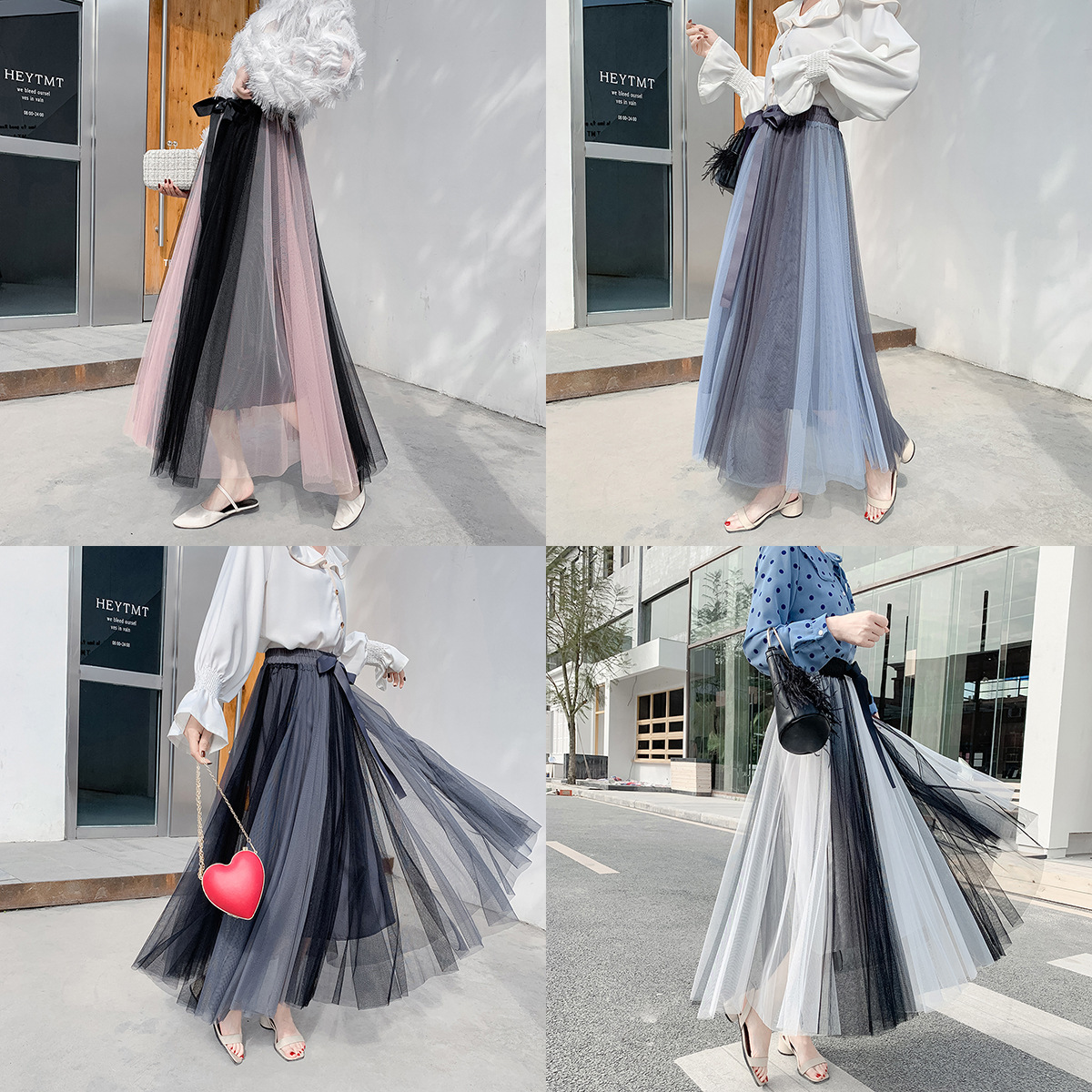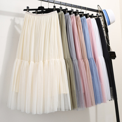 Real shot musim semi dan musim gugur rok lipit jala wanita rok kasa musim panas rok panjang a-line rok populer panjang setengah