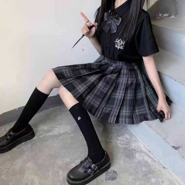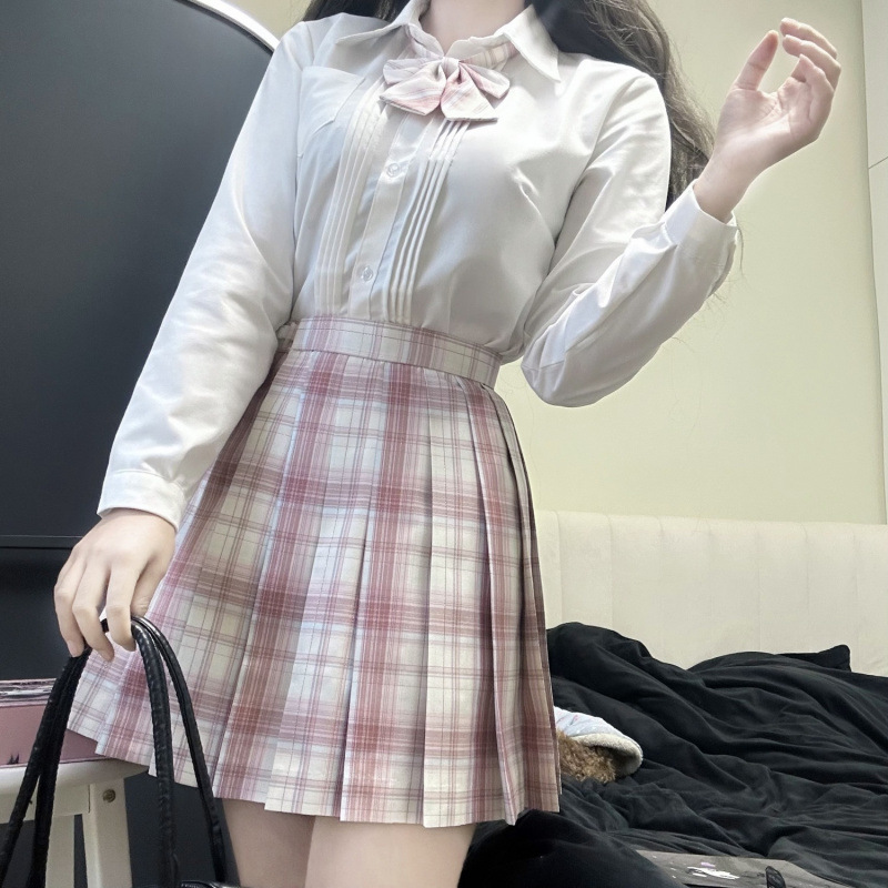 Setelan Kemeja Lengan Pendek Ketat Pinggang Seragam JK Gaya Jepang Asli Atasan Wanita Rok Lipit Gaya Sekolah Musim Panas Rok Pendek Wanita