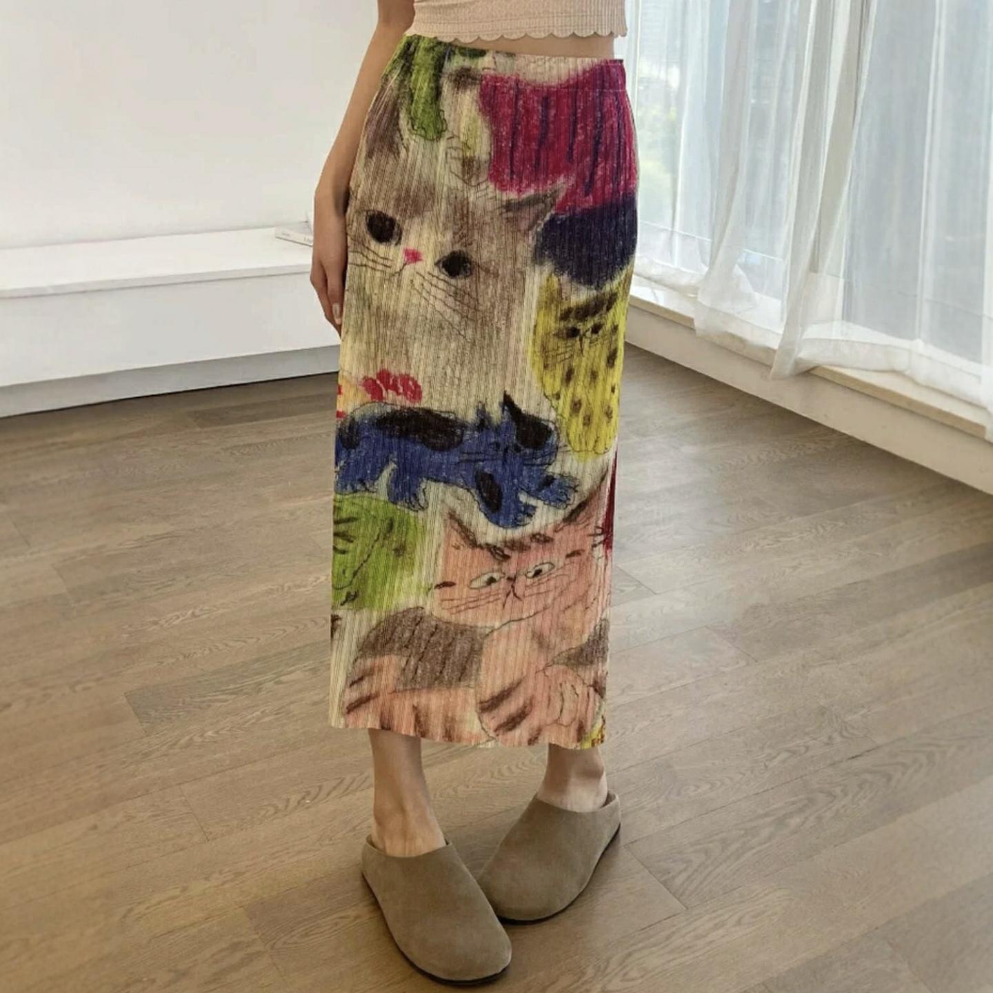 Rok Panjang Setengah Badan Musim Panas Motif Cetak Kucing Miyake Rok Setengah Badan Terlihat Langsing Model Baru Rok Setengah Tubuh Kecil Mudah Dipadu Padan Pinggang Elastis
