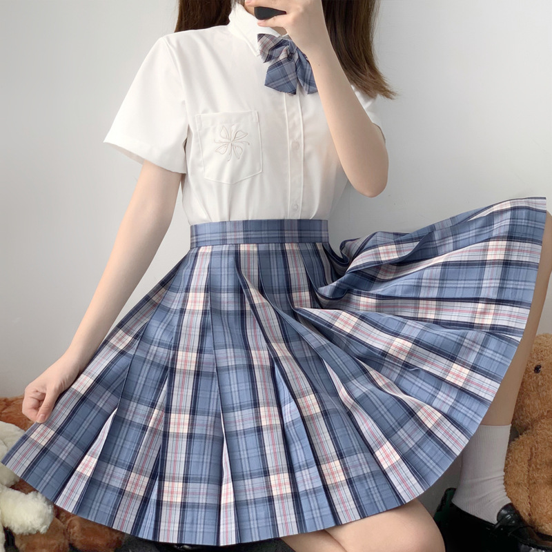Cool House JK rok kotak-kotak, setelan seragam musim panas warna solid, rok lipit putih dasar anak perempuan gaya preppy