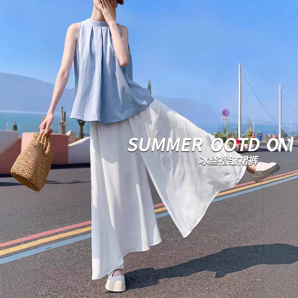 Celana kulot sutra es Anti eksposur wanita rok peri satin berlipat bentuk A tipis celana kaki lebar rok pinggang tinggi musim panas