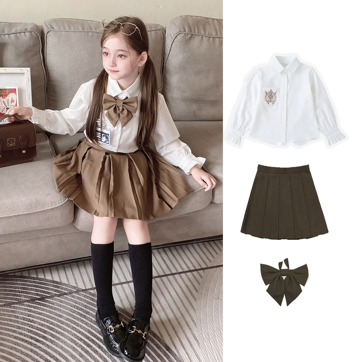 Setelan rok pendek anak perempuan, pakaian rok lipit seragam jk dua potong, rok kotak-kotak lengan panjang gaya Barat baru