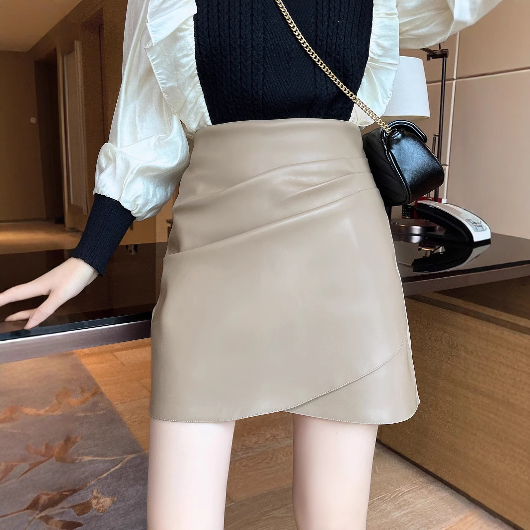 Rok kulit PU untuk wanita, rok kulit PU ramping pinggang tinggi lipit tidak beraturan hitam cocok untuk semua musim gugur dan musim dingin 2024