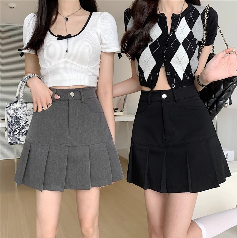 Rok lipit hitam wanita, rok jk kecil ramping baru musim panas musim semi dan musim gugur pinggang tinggi abu-abu a-line 2022