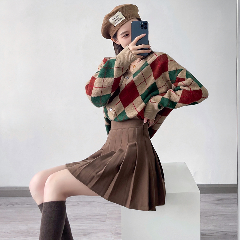Rok lipit wanita musim semi dan musim panas, rok lipit wanita gaya Korea pinggang tinggi musim gugur dan musim dingin ukuran besar kotak-kotak