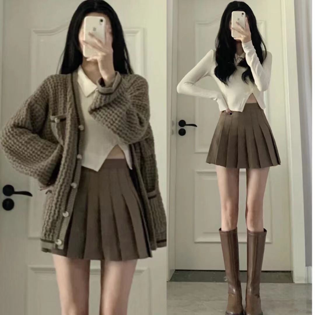 Rok lipit cokelat kualitas baik wanita, rok a-line pelangsing serbaguna gaya Korea pinggang tinggi JK preppy 825