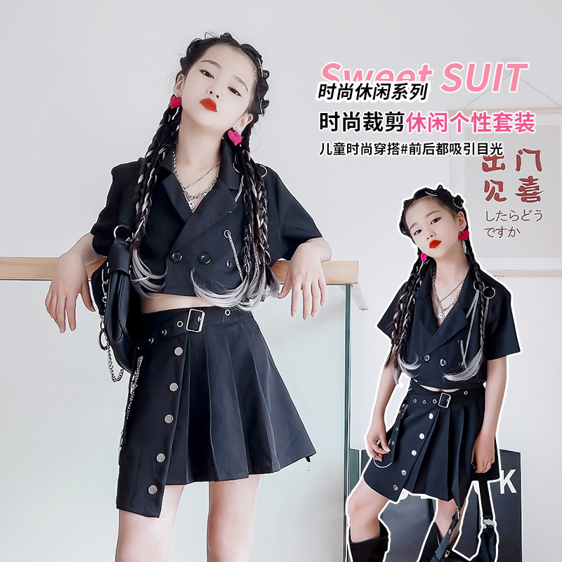 Rok setelan anak perempuan, lengan pendek, rompi rok seragam jk, gaya Barat, setelan terkena pusar, rok lipit dua potong, rok musim panas