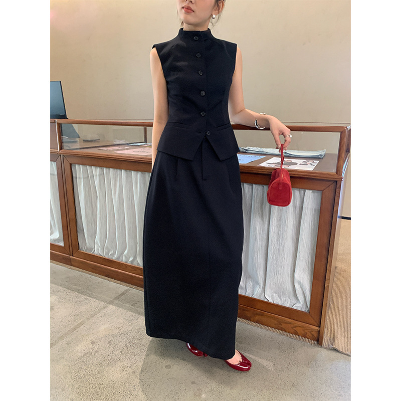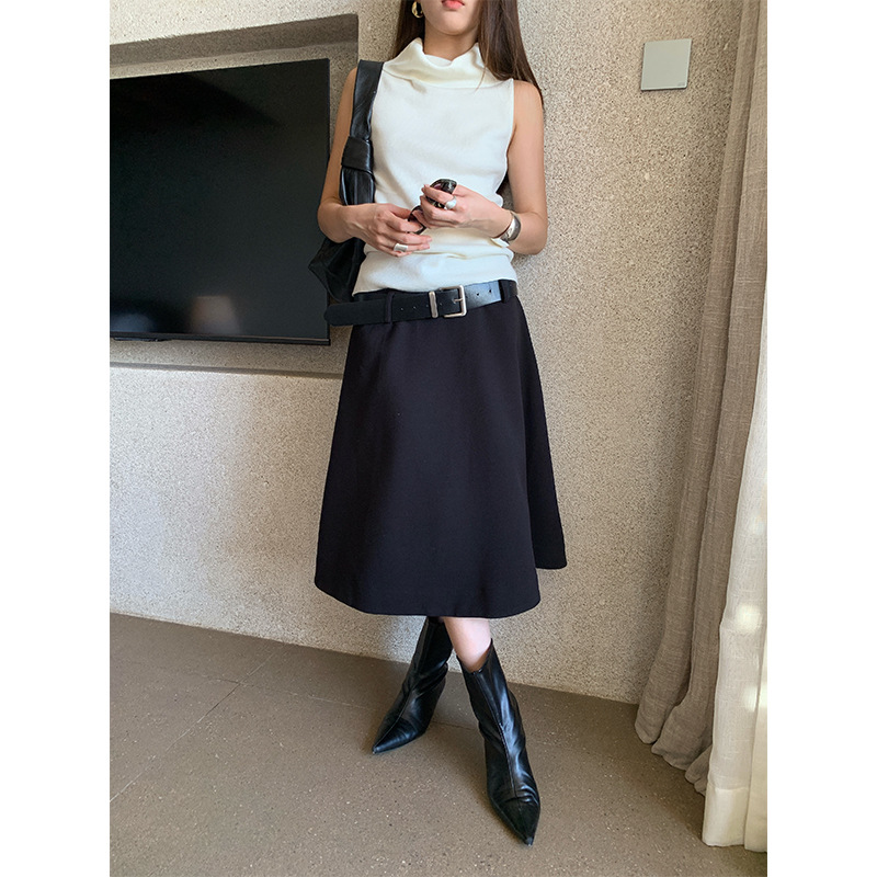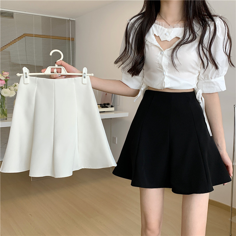 Rok desain warna polos musim semi dan panas 2023 rok a-line populer pelangsing pinggang tinggi rok hitam kecil wanita