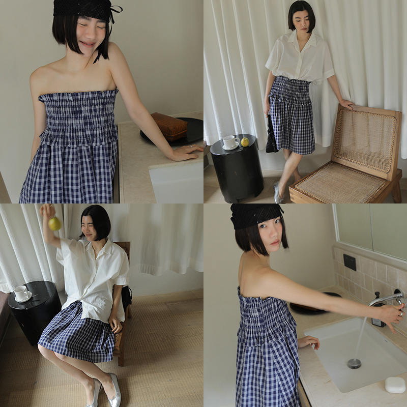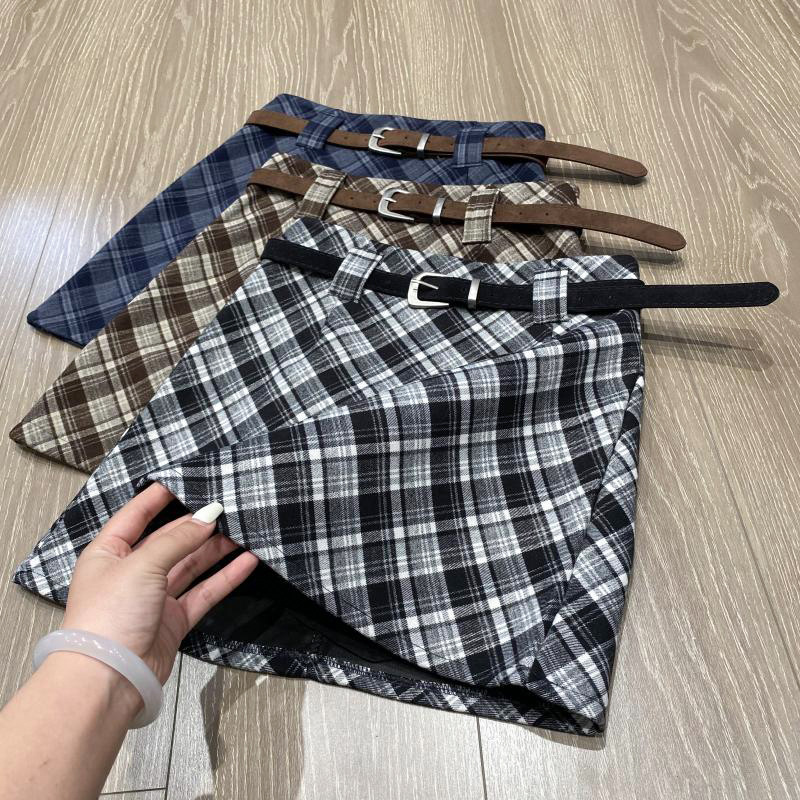 Rok Setengah Badan Lipit Pola kotak-kotak Dua Pakai Chic Moment Blues Moment Sederhana Rok Payung Kasual Mudah Dipadu Padan Santai 00900