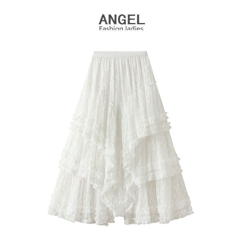 Rok Setengah Badan Kain Jaring Tidak Teratur Renda Industri Berat Warna Putih Rok Kue Gaya Tinggi Musim Semi Musim Gugur Wanita Rok Besar 2559
