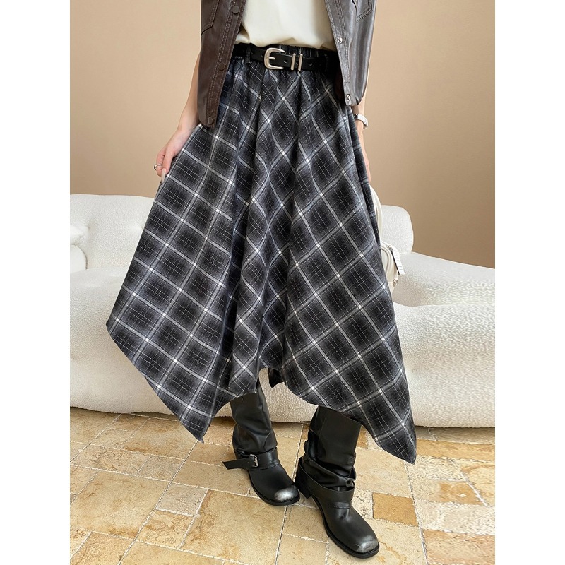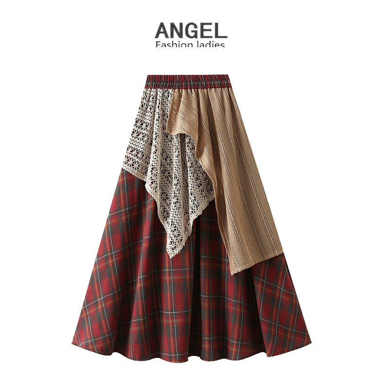 Gaya Santai Model Baru Musim Semi 2025 Rok Setengah Renda Kotak-Kotak Industri Berat Tidak Beraturan Rok Panjang Pinggang Tinggi D8856