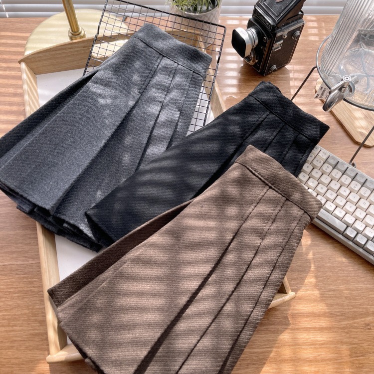 Rok lipit abu-abu gelap wanita, rok lipit pinggang tinggi pelangsing wol musim gugur dan musim dingin 2023, rok jk a-line wanita