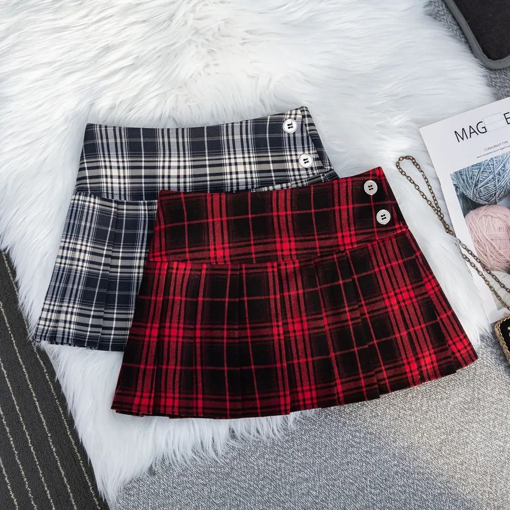 Rok Lipit Kotak-Kotak Merah Gaya Amerika Retro Rok Setengah Badan JK Gadis Pedas Gaya Desain Musim Semi Musim Gugur Rok Pendek Huruf A Gaya Kampus