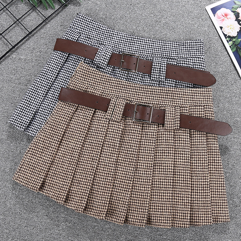 Rok lipit gaya Preppy houndstooth, rok pendek anak perempuan hot pinggang tinggi musim dingin 2023, sabuk rok jk anti eksposur
