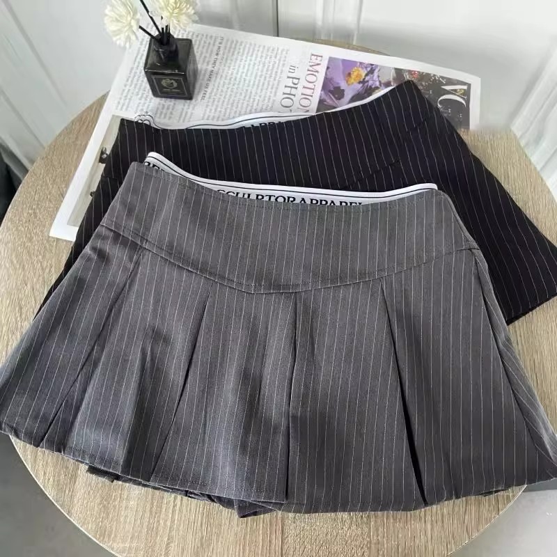 Kualitas Tinggi Rok Lipit Pinggang Tinggi Abu-abu Wanita Musim Gugur Musim Dingin dan Musim Panas 2024 Rok Pendek Terlihat Langsing Model Baru Rok Setengah Badan A-Line JK