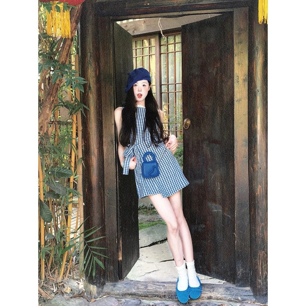 Gaun Tanpa Lengan Kotak-Kotak Warna Biru Rok Pendek Model Pendek Ikatan Kupu-Kupu Tali Musim Panas Gaya Desain Rok Pendek Pelangsing Pinggang