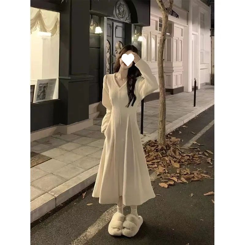 Gaun lengan panjang leher V terpisah, gaun teh Perancis, rok panjang retro elegan kelas tinggi musim gugur dan musim dingin