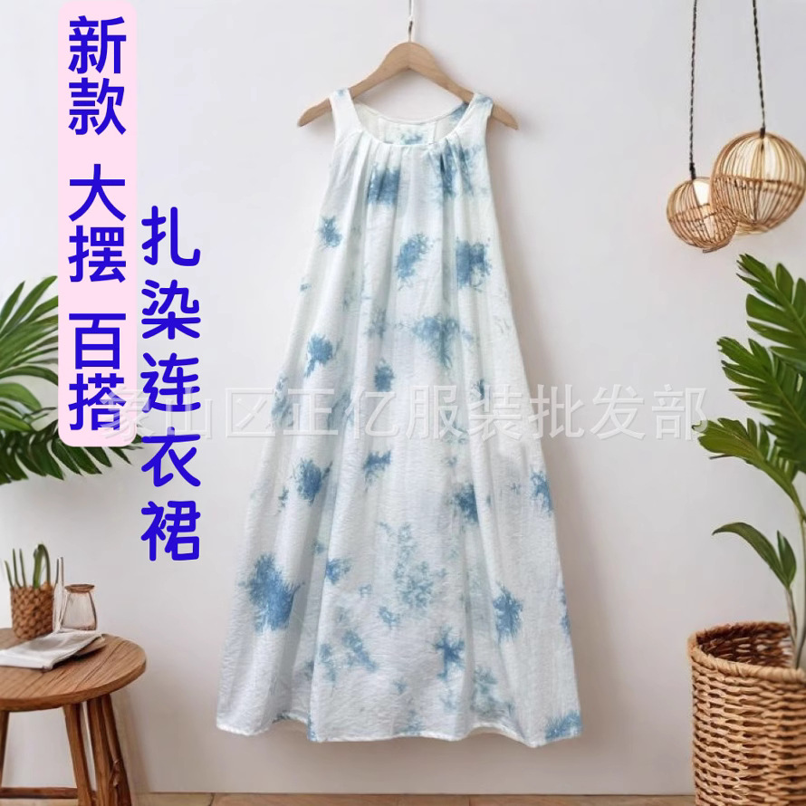 Gaun Terusan Gaya Etnik Dye Dye Dali Gaun Kasual Pinggang Besar Pinggang Lebar Leher Bulat Musim Panas Berwarna Biru Putih