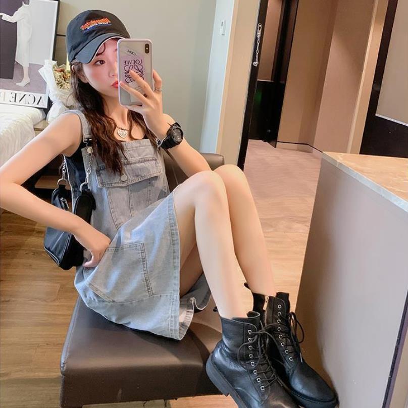 Rok suspender Denim wanita, rok pelangsing longgar pengurang usia gaya Korea musim panas 2023 untuk murid perempuan