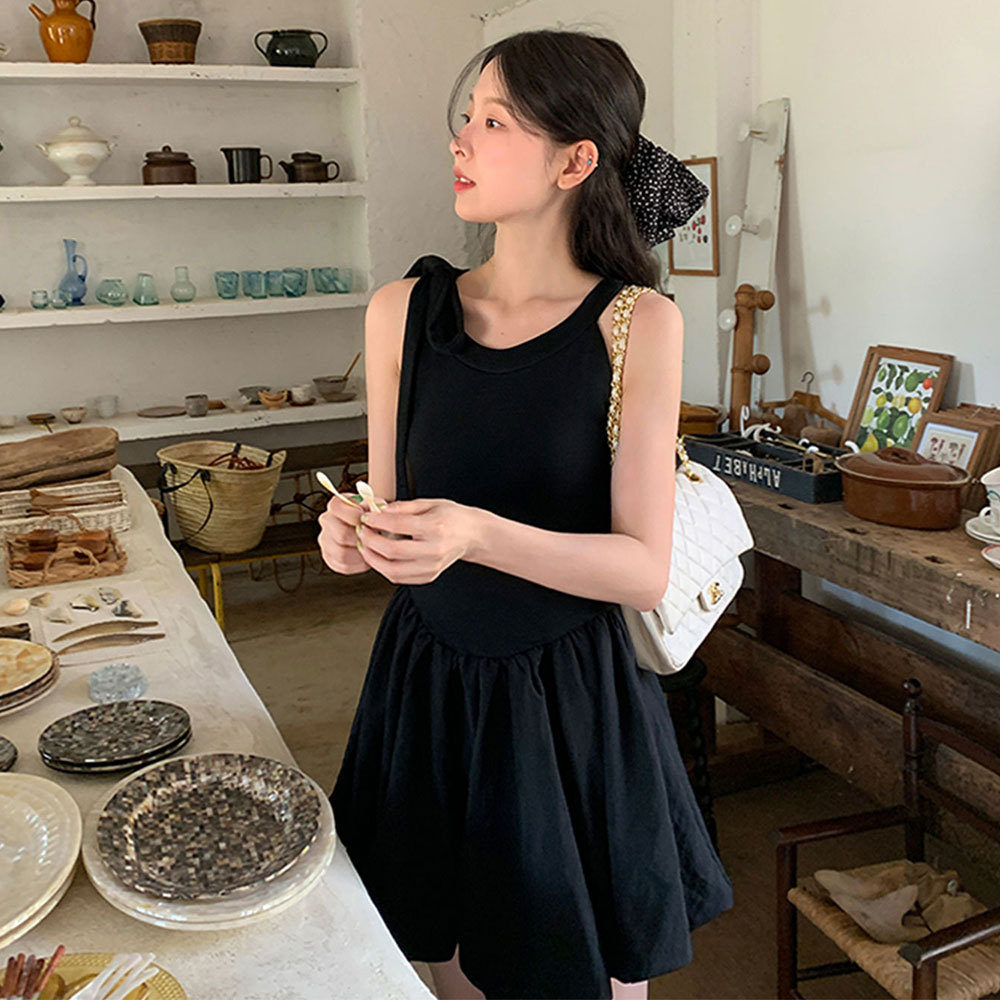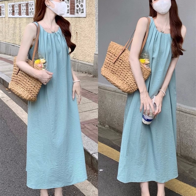 Gaun liburan pantai wanita, gaun rompi tanpa lengan longgar pelajar Jepang a-line (dengan saku)