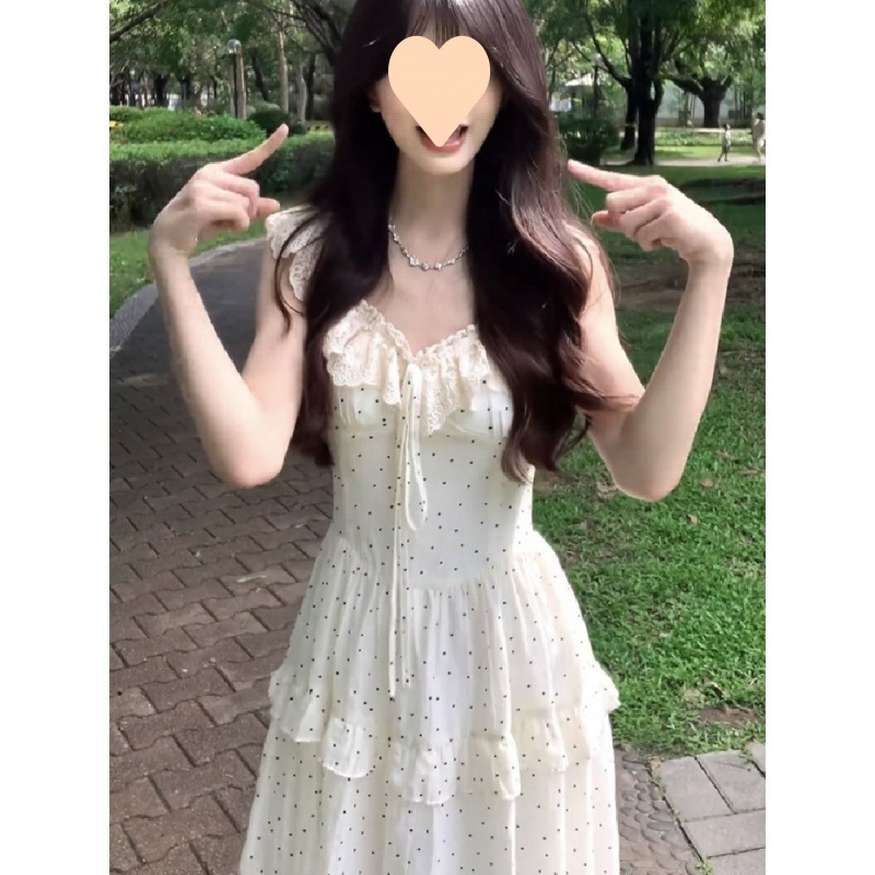 Gaun Polt Dot Menakjubkan Gaya Gadis Gaya Liburan Rok Peri Membentuk Pinggang Renda Gaya Manis Musim Panas Siswa Wanita