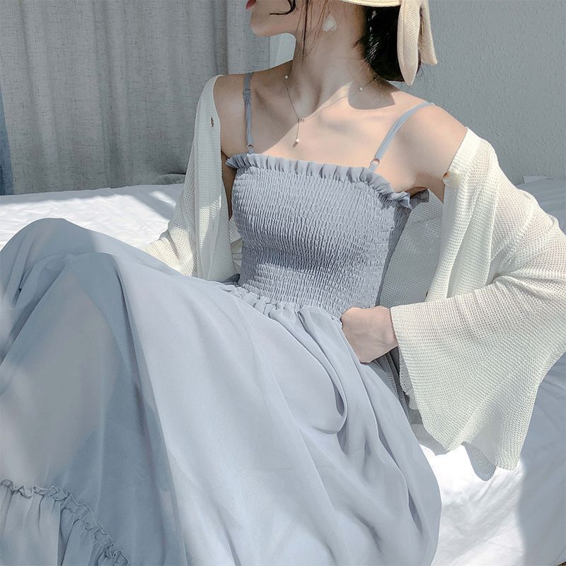 Rok suspender gaya Korea wanita, mantel/gaun sifon musim panas ins Super peri manis panjang setengah