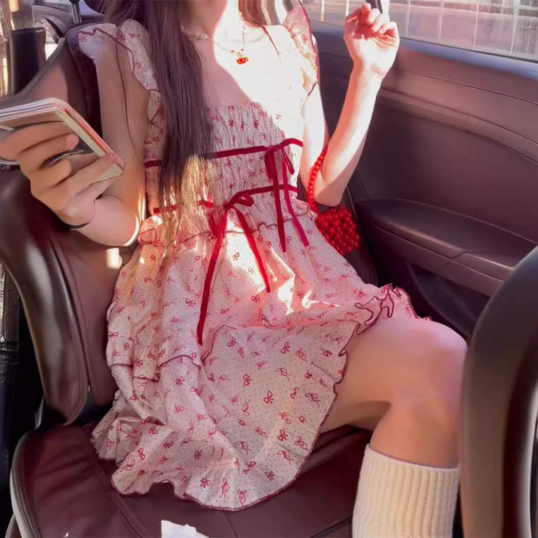 Dopamin Rok Gadis Manis Bertekstur Musim Panas Model Baru Gaun Selempang Pola Grit Gadis Manis Murni Gaya