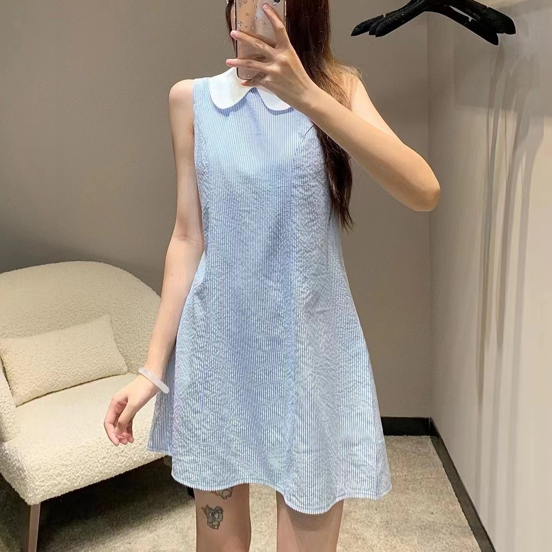 Gaun rompi bergaris-garis anak perempuan, Gaun rompi renda tanpa lengan ramping kecil kerah boneka gaya Inggris musim panas baru