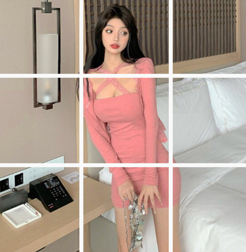 Dress rajut renda, gaun selempang seksi + kardigan pelangsing set dua potong 8102 tiga merah muda abu-abu
