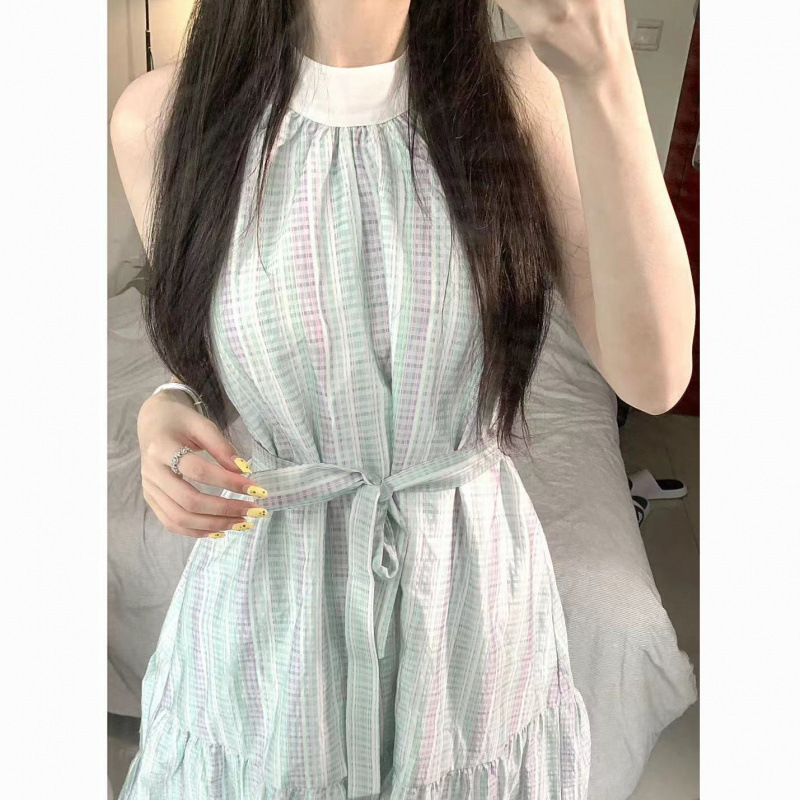 Gaun Gantung Bahu Terbuka Kombinasi Pola Kotak Retro Gaya Jepang Rok Panjang Terlihat Langsing Pinggang Model Baru Musim Panas Siswa Perempuan