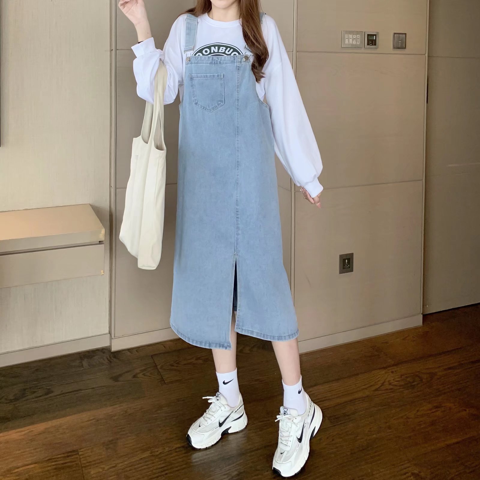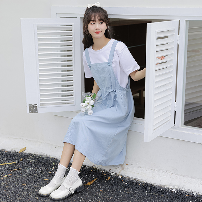 Gaun tali Denim, rok suspender Denim setengah panjang, baju kecil siswa muda ramping gaya Korea longgar musim semi dan musim gugur