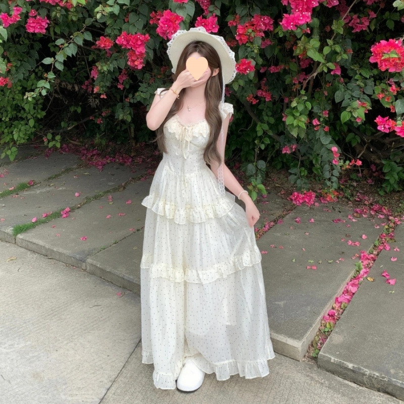 Gaun Pinggang Terlihat Langsing Pinggang Lipat Gaya Liburan Gaya Prancis Rok Pantai Polo Dot Musim Panas Siswa Wanita