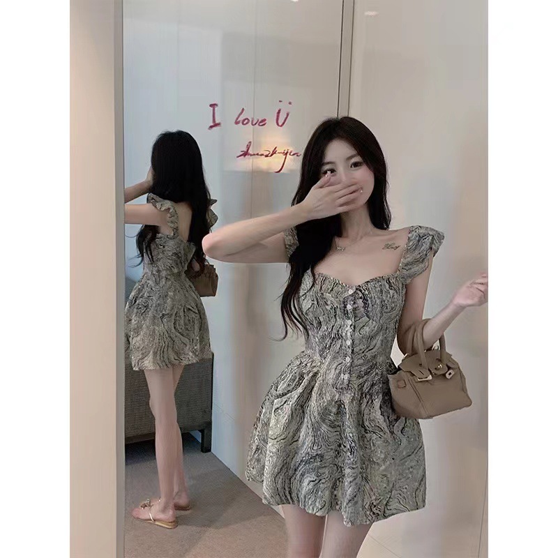 Gaun suspender kerah persegi pinggang ketat musim panas 2023 rok pendek empuk wanita seksi punggung terbuka pelajar gadis seksi lembut