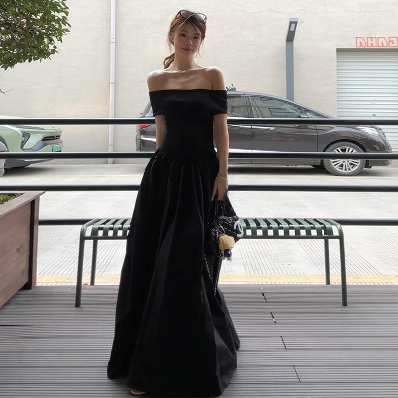 Gaun Bahu Warna Hitam Wanita Rok Panjang Seksi Hepburn Bahu Terbuka Pinggang Gaya Prancis Terlihat Langsing Pinggang Musim Panas Model Baru 2025