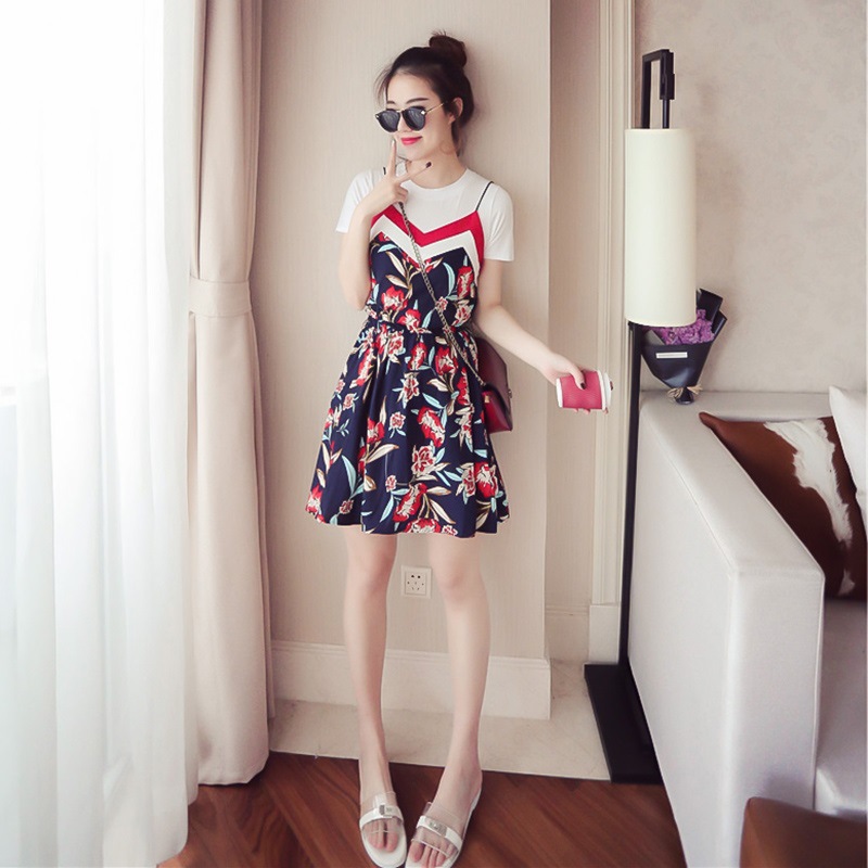 2024 musim panas gaya Korea baru pinggang tinggi tali bunga gaun T-shirt fashion slim pelangsing dua potong set 8032
