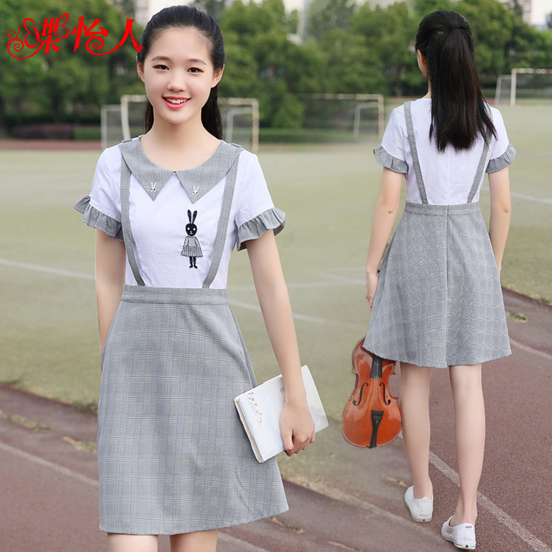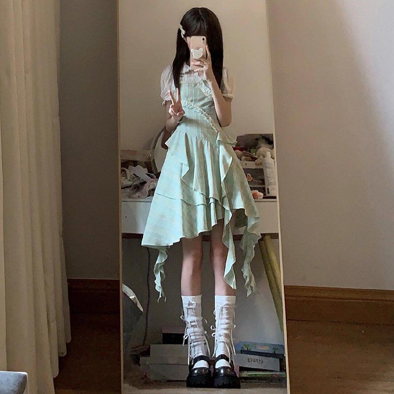 Setelan Musim Panas Gaya Jepang Gaun Sling Rok Orang Kecil Manis Tidak Beraturan Kemeja Lengan Pendek Pelajar Perempuan