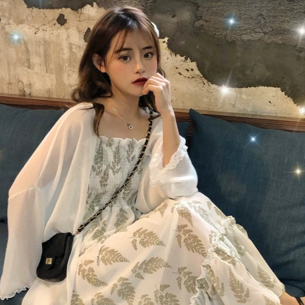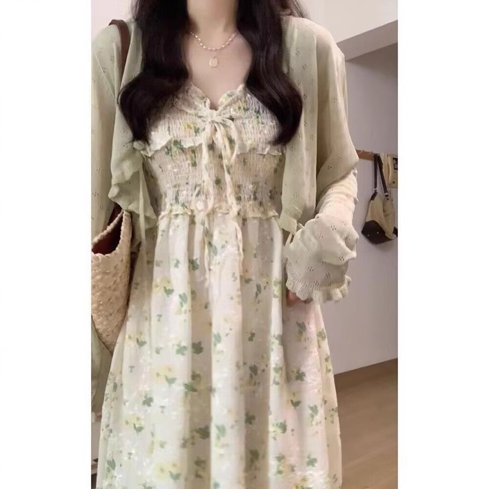 Rok Bunga Set Gaun Suspender Model Baru Rok Pendek Gaya Pedas Manis Murid Musim Panas Wanita Kardigan Anti Matahari