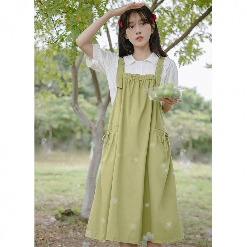 Gaun Tali Punggung Gaya Sekolahan Susu Jepang Model Baru Musim Panas Rok Suspender Model Panjang Sedang Longgar Wanita Dua Set