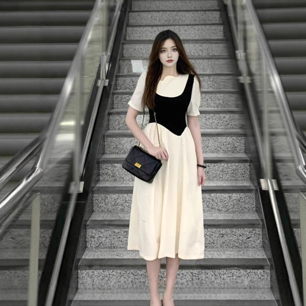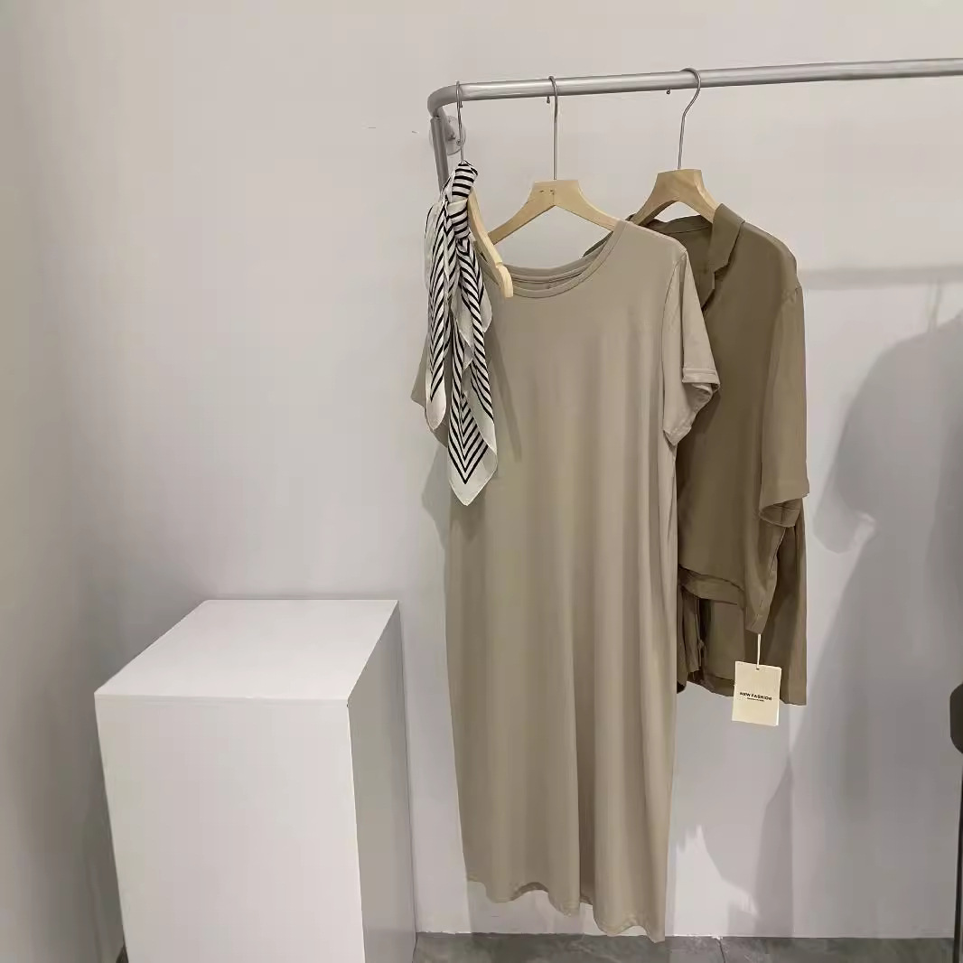 Gaun rok wanita lengan pendek, rok kaus katun dan linen lengan pendek, rok kaus murid segar panjang menengah 2021