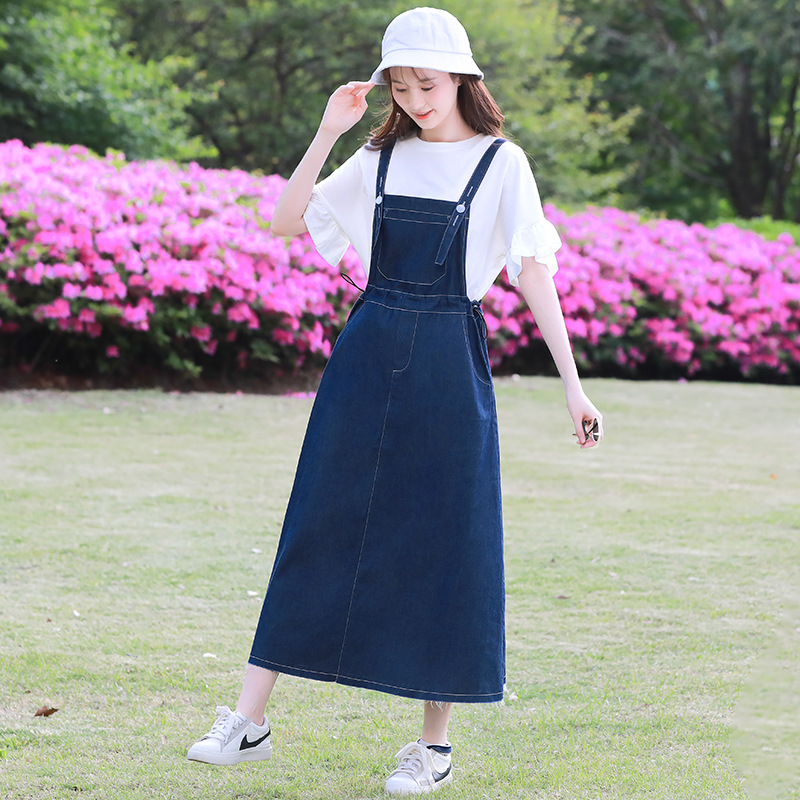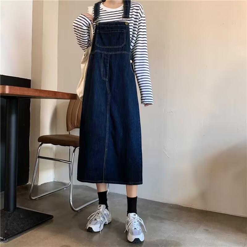 Rok suspender Denim wanita, rok suspender temperamen niche, baru musim gugur longgar ukuran besar siswa Gemuk Semua cocok