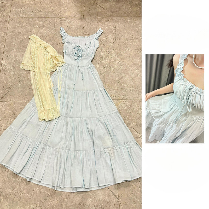 Gaun Dua Potong Renda Palsu Gardenia Musim Panas Pabrik Rok Panjang Tali Cantik Murni Dipakai di Awal Musim Panas 2025 Wanita