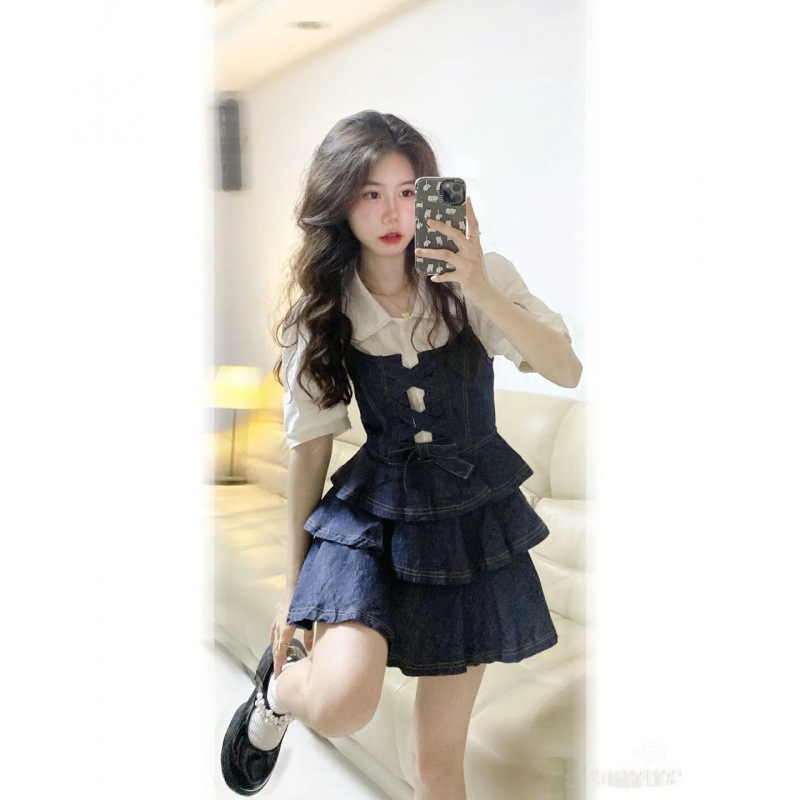 Gaun Kue Denim Lengan Pendek Kemeja Murid Warna Putih Pita Kupu-Kupu Pinggir Daun Teratai Gadis Manis Musim Panas