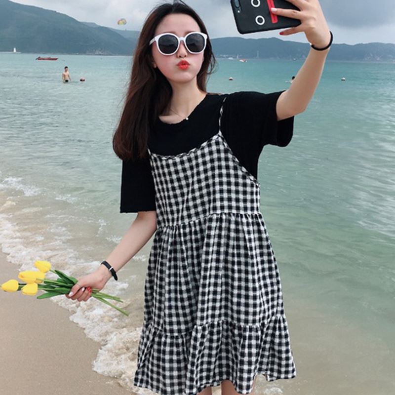 Gaun gemuk wanita ukuran Plus setelan siswa luar negeri Xia baru kaus baju kotak-kotak atasan dua set