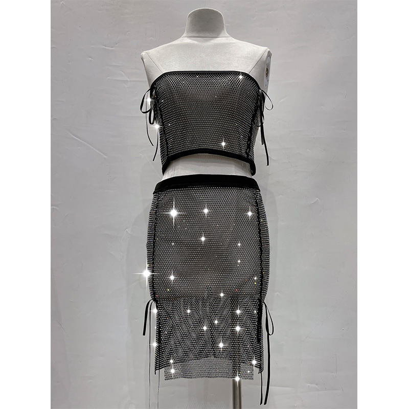 Setelan berlian imitasi penuh wanita mode Eropa dan Amerika baru rok atas tube-built elastis tali pita desain niche