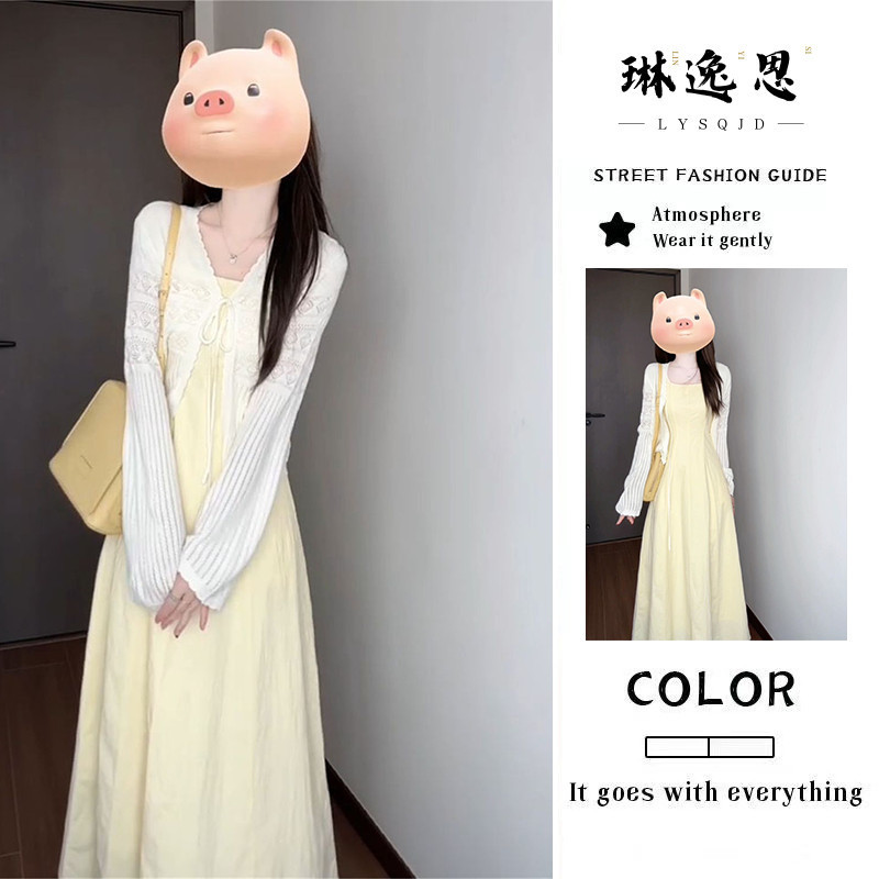 Gaun Tali Pinggang Mengikat Pinggang Warna Kuning Susu Set Dipakai untuk Gaya Prancis Lembut Baju Pelindung Terik Matahari Tipis untuk Siswa Wanita