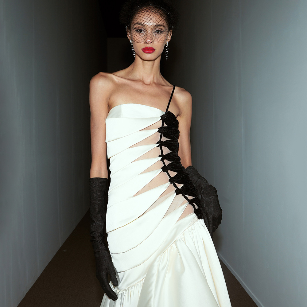Gaun Ekor Ikan dengan Payudara Model Ledakan Musim Semi dan Musim Panas Gaun Malam Warna Kontras Hitam dan Putih Bahu Tunggal Gaun Pesta Perjamuan Senior Rok Panjang Wanita