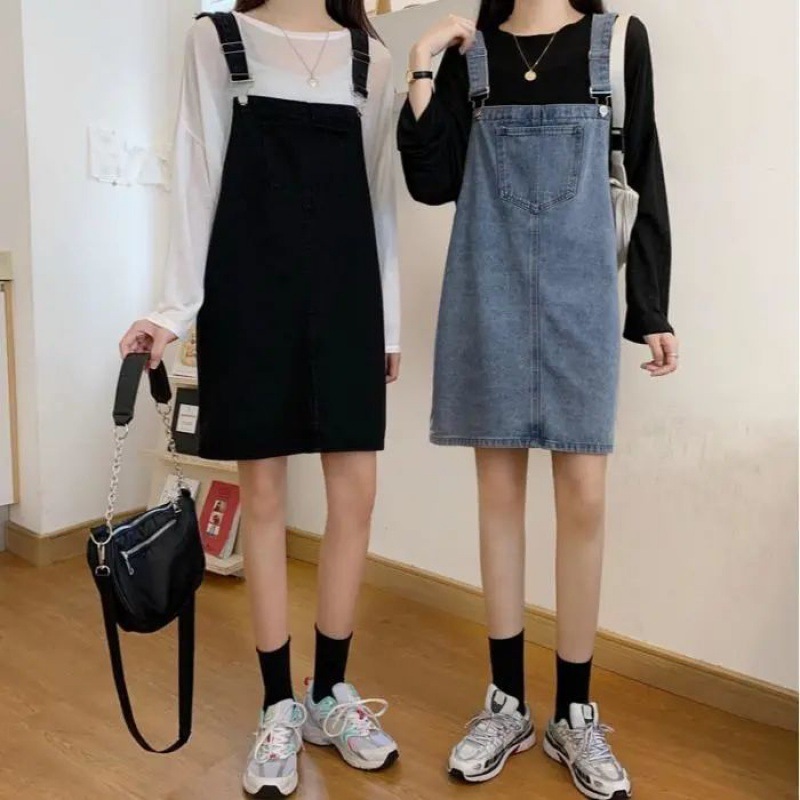 Rok pendek tali Denim kecil wanita musim semi dan musim panas baru ukuran plus gadis gemuk longgar usia siswa gaun selempang pasang