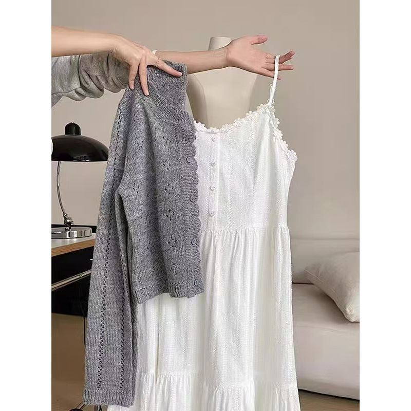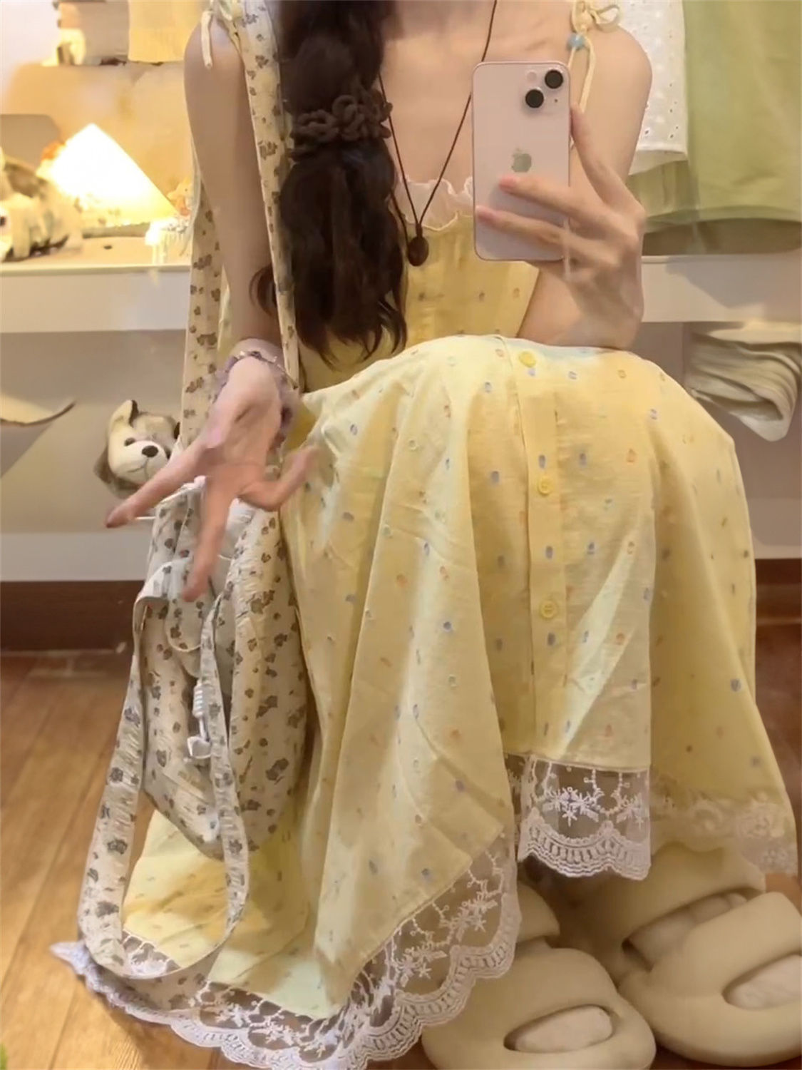 Gaun Suspender Jahitan Renda Elegan Gaya Prancis Rok Panjang Huruf A Menutupi Daging Longgar Musim Panas Siswa Perempuan