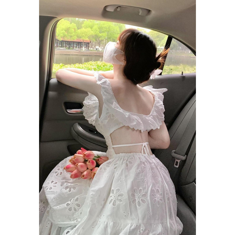 Rok A-Line Terlihat Langsing Desain Kerah Persegi Manis Musim Panas Gaun Suspender Punggung Terbuka Lengan Terbang Kecil Warna Putih Gaya Prancis Pelajar Perempuan