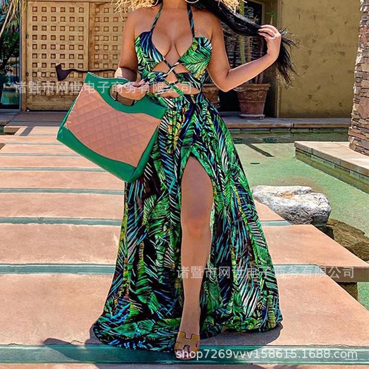 2021 perdagangan luar negeri gambar resmi gaun panjang susu sutra tali dicetak temperamen komuter pakaian wanita hijau